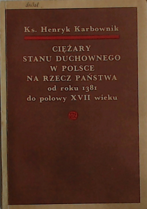 Ciężary stanu duchownego w Polsce na rzecz państwa od roku 1381 do połowy XVII wieku / Henryk Karbownik.