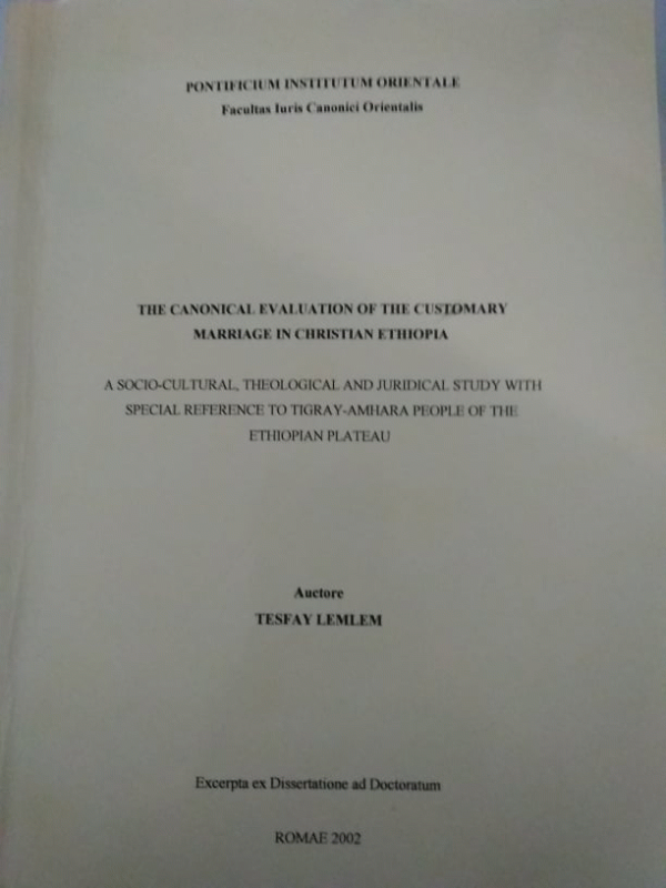 The canonical evaluation of the customary marriage in Christian Ethiopia : a socio-cultural, theological and juridical study with special reference to Tigray-Amhara people of the Ethiopian plateau / Tesfay Lemlem ; Pontificium Institutum Orientale, Facultas Iuris Canonici Orientalis.