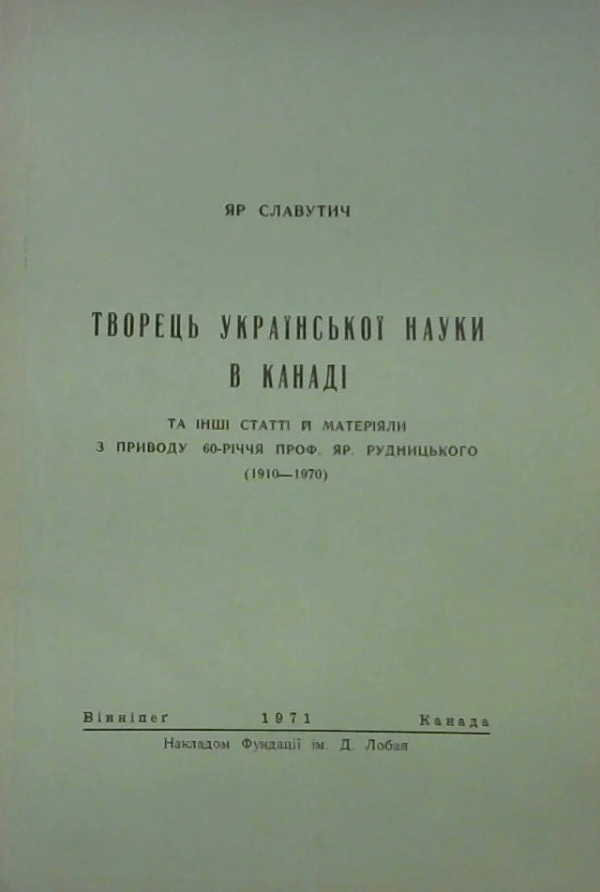 "Творець української науки в Канаді" та інші статті й матеріяли з приводу 60-річчя проф. Яр. Рудницького / Яр Славутич.